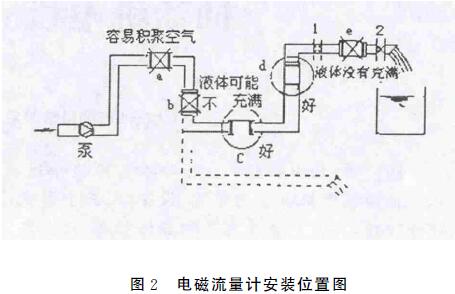 3.2.4對于電極可拆卸的儀表在安裝時方向錯誤。部分污水流量計的電極并非安裝在表體測量管壁上,而是與表頭一體并可拆卸,在安裝時要注意兩個電極的連線應(yīng)與液體流向保持垂直。3.2.5液體未充滿管道,電極之間含有氣體。管道未充滿液體主要是管網(wǎng)工程設(shè)計或儀表安裝位置不當(dāng),使傳感器測量管內(nèi)不能充滿液體。應(yīng)避免安裝如圖所示a、e的位置和以虛線管排放時b位置,改裝到c,d位置較好。水平安裝時應(yīng)使電極的連線保持水平,如果電極一上一下,下部電極會由于介質(zhì)內(nèi)雜質(zhì)沉淀覆蓋電極,上部電極會由于氣泡堆積造成電極與介質(zhì)絕緣。垂直安裝時應(yīng)裝在流體自下而上流動的管道上,這樣更容易使液體充滿管道。