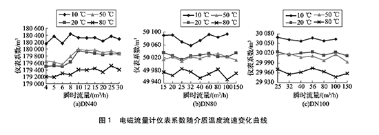 由圖1可得:( 1)隨著介質溫度的升高,廢水流量計的儀表系數均呈逐漸降低的趨勢。其中20℃和50℃的儀表系數基本相同,10℃和80 0C的儀表系數與20℃時偏離較大。(2)溫度對廢水流量計的儀表系數在高溫以及低溫處影響明顯,以D N40廢水流量計為例,儀表系數本次實驗高低溫處*大變化量約為0. 7% o ( 3)在廢水流量計相應的流量范圍內,在同一溫度下,隨著介質流速的變化,廢水流量計的儀表系數在個別點出現略微浮動,但整體變化不超過1 0. 2 %。