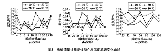 將實驗測得的廢水流量計在不同溫度及流速下的重復性數據整理,特性曲線如圖2所示,3組曲線分別對應DN40, DN80, DN100的3塊廢水流量計的重復性曲線。