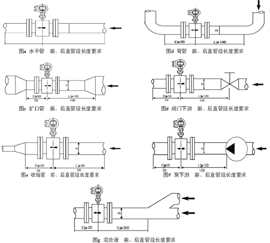 傳感器安裝管道上游側(cè)直管段長(zhǎng)度應(yīng)大于或等于10D,下游側(cè)應(yīng)不小于5D(D為被測(cè)管道通徑)。
