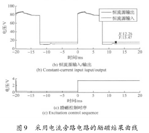 實驗結果表明,高壓源向低壓源切換后,三端穩壓器的工作特性致使的電流波動和低壓源供電情況下的恒流控制,會大幅延長勵磁電流的穩態響應時間。圖8所示勵磁電流約在17ms左右進入穩態,圖9所示勵磁電流的穩態響應時間約為12ms。這表明,在采用三端穩壓器搭建恒流控制電路的情況下,電流旁路電路能有效克服三端穩壓器工作特性的影響,并能方便的實現電流超調,加快勵磁電流的響應速度。
