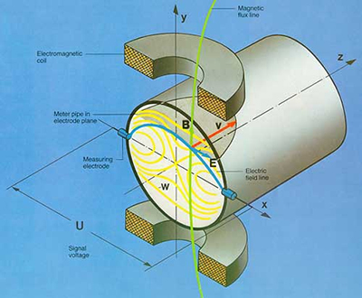電磁流量計(jì)的工作原理是基于法拉*電磁感應(yīng)定律。在測(cè)量管內(nèi)的導(dǎo)電介質(zhì)相當(dāng)于法拉*試驗(yàn)中的導(dǎo)電金屬桿,上下兩端的兩個(gè)電磁線圈產(chǎn)生恒定磁場(chǎng)。當(dāng)有導(dǎo)電介質(zhì)流過時(shí),則會(huì)產(chǎn)生感應(yīng)電壓。管道內(nèi)部的兩個(gè)電極測(cè)量產(chǎn)生的感應(yīng)電壓。