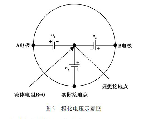 在被測(cè)液體與電極和接液部件接觸過程中,電解質(zhì)中的正負(fù)離子會(huì)分別作定向運(yùn)動(dòng),這會(huì)使被測(cè)液體在電極和接液部件之間形成電位差,通常將這種現(xiàn)象稱為極化現(xiàn)象。如圖3 所示,理論上來說,兩電極A 和B 對(duì)接液部件的電位e1、e2大小相等、方向相反,此時(shí)兩電極的電位差等于零。但是,若兩電極的材質(zhì)或表面狀態(tài)存在差異,此時(shí)A、B 電極之間的電位差就不為零,這就形成了極化電壓,極化電壓與共模狀態(tài)的電壓e3一起疊加在流量信號(hào)中,被輸入轉(zhuǎn)換器的差動(dòng)放大器。當(dāng)極化電壓過大,則會(huì)對(duì)差動(dòng)放大器的輸入端造成較大影響,導(dǎo)致信號(hào)無法放大或流量信號(hào)的輸出波動(dòng)過大,從而降低了衛(wèi)生型卡箍電磁流量計(jì)的測(cè)量精度。