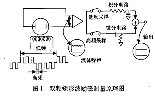 雙頻矩形波勵磁測量原理如圖l所示,一個由高低頻分量迭加而成的電磁場通過勵磁線圈被施加到被測液體中,勵磁波形是在一個低頻矩形波上迭加一個高于市電頻率的矩形波而得到的波形。在產(chǎn)生的電動勢中,低頻分量通過一個大時間常數(shù)的積分電路獲得一個零點(diǎn)穩(wěn)定性好的平穩(wěn)流量信號。而由漿液或低電導(dǎo)率流體產(chǎn)生的低頻噪聲可被不受噪聲影響的高頻采樣電路所抑制,有著同樣時間常數(shù)的流量信號經(jīng)過一個差分電路以確定流速信號的變化,把這兩種不同頻率采樣所得的信號結(jié)合起來可獲得一個穩(wěn)定流速信號,該信號不受噪聲干擾,且有較高的零點(diǎn)穩(wěn)定性。