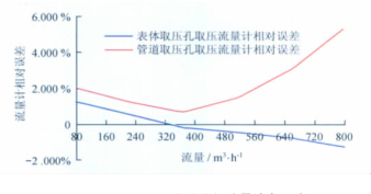 從以上數(shù)據(jù)表和曲線圖中可以看出:天燃?xì)饬髁坑?jì)型號一定的情況下,用表體取壓孔取壓方式檢定流量計(jì)時(shí)流量計(jì)的線性度較好,用管道取壓孔取壓方式檢定流量計(jì)時(shí)流量計(jì)的線性度較差;流量測點(diǎn)相同的情況下,表體取壓孔取壓檢定方式的流量計(jì)誤差較小,管道取壓孔取壓檢定方式的流量計(jì)誤差較大;兩種取壓方式引起的誤差隨著流量的增大而逐漸增大,在流量為2 900m3/h時(shí)兩者相差近6.2%,遠(yuǎn)遠(yuǎn)超出了流量計(jì)的準(zhǔn)確度等級。所以,在天燃?xì)饬髁坑?jì)的檢定過程中,應(yīng)避免在流量計(jì)表體取壓孔以外的地方取壓進(jìn)行檢定。