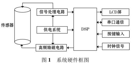 高頻勵磁管道流量計由傳感器、高頻勵磁電路、信號處理電路等組成,其中高頻勵磁電路決定著傳感器磁場的強弱,勵磁電路的穩(wěn)定性以及精確性決定著系統(tǒng)檢測的準確性以及穩(wěn)定性。DSP 系統(tǒng)控制勵磁電路激勵傳感器線圈,當線圈中有導電液體流過時,其切割磁感線并在傳感器兩端的線圈上產生感應電動勢,利用信號檢測電路監(jiān)測感應電動勢的大小,*后根據(jù)相應關系計算出液體的流量,系統(tǒng)硬件框圖如圖 1 所示。