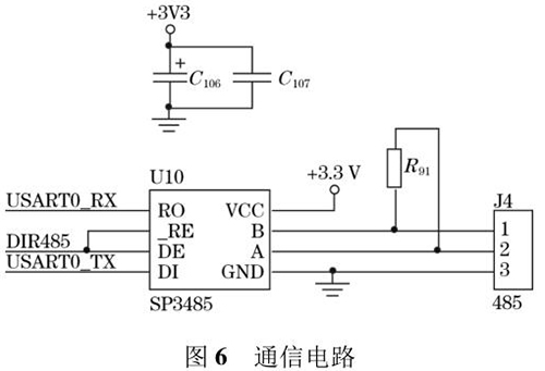 管道流量計輸出的流量值可以通過外接的 TFTLCD 屏直接顯示,還可以通過預留的 RS485 通信接口將數(shù)據(jù)發(fā)送到上位機中。RS485 電路*大的優(yōu)點是 485 電平與 TTL 電平兼容,方便與 TTL 電路相連;抗共模干擾能力強;數(shù)據(jù)傳輸速度快,高達 10 Mbps;通信距離遠,*大為 1.2 km。系統(tǒng)采用 SP3485 芯片進行數(shù)據(jù)通信,SP3485 是一款低功耗芯片且符合RS485 協(xié)議的收發(fā)器,電路圖如圖 6 所示。
