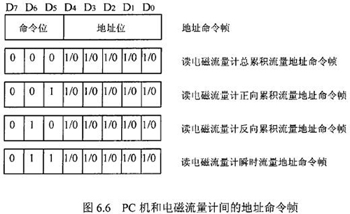 由于RS一485電氣標(biāo)準(zhǔn)規(guī)定每段只能聯(lián)結(jié)犯個節(jié)點(diǎn)設(shè)備,因此可用地址幀中五個二進(jìn)制位表示這32個地址,其余3位用來表示命令,從而構(gòu)成地址命令幀。對于控制命令需求不超過八個的通信系統(tǒng),采用地址命令幀可壓縮報文長度提高通信效率。在污水網(wǎng)絡(luò)監(jiān)控系統(tǒng)中,飲用水流量計和PC機(jī)通信的主要目的是將流量計中的有用數(shù)據(jù)讀到PC機(jī)中。這些數(shù)據(jù)包括:總累積流量、正向累積流量、反向累積流量、瞬時流量。通信時,PC機(jī)只需向飲用水流量計發(fā)送讀總累積流量、讀正向累積流量、讀反向累積流量、讀瞬時流量命令即可,因此二者間通信所用的地址幀和命令幀可合二為一,用一個地址命令幀代替。PC機(jī)和飲用水流量計間的地址命令幀定義如圖.66所示。根據(jù)污水網(wǎng)絡(luò)監(jiān)控系統(tǒng)中PC機(jī)與飲用水流量計間通信的特殊性,二者通信所使用的報文可簡化為圖.67的格式。