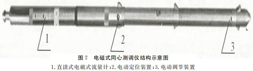 電磁式同心測調(diào)儀是同心分層注水工藝技術的關鍵儀器,其設計理念:集成流量測試與水量調(diào)節(jié)于一體,實現(xiàn)測調(diào)同 步;動力傳遞設計為同心降速機制,機械結(jié)構(gòu)簡單,動力傳遞效率高,測調(diào)穩(wěn)定性高。主要包括以下結(jié)構(gòu),如圖2所示。