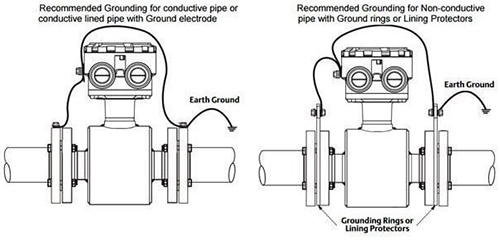 法蘭式流量管:當(dāng)法蘭式流量管安裝在非金屬,塑料,PVC或襯里的工藝管道之間時(shí),SG必須通過(guò)除工藝管道法蘭螺栓之外的其他路徑。在這種安裝方案中,需要接地環(huán)或接地電極(圖6)。