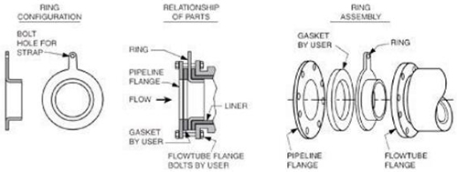 對(duì)于接地環(huán)應(yīng)用,如果使用傳統(tǒng)的孔板式或C型接地環(huán),則必須使用接地帶將接地環(huán)連接到流量管的主體/外殼。這些帶子連接到流量管的法蘭上,或接地線連接到位于其遠(yuǎn)程接線盒或頂部安裝的變送器接口板上的接線片上。E型接地環(huán)使用客戶(hù)提供的螺栓,而不是接地線或接地帶。