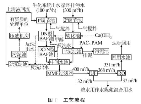 2種廢水在中間水池混勻后,通過泵提升進(jìn)入保安過濾器,進(jìn)一步去除細(xì)小的懸浮物后經(jīng)過增壓泵進(jìn)入超濾膜(UF)處理系統(tǒng)和反滲透(RO)系統(tǒng),然后通過液體電磁流量計進(jìn)行計量。反滲透出水直接進(jìn)入回用水池達(dá)標(biāo)回用,超濾濃水以及反滲透濃水用作水煤漿混合用水。污泥池中的污泥通過泵打入帶式機壓濾處理,濾液自流進(jìn)入1#調(diào)節(jié)池。工藝流程見圖1。