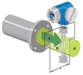 該電壓由安裝在管道式電磁流量計主體中的感應電極檢測,并發送到變送器,變送器根據管道尺寸計算體積流量。