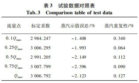 測試對象為同一臺(tái)表,DN80 口徑,帶有在空氣標(biāo)定裝置上的 5 點(diǎn)標(biāo)定系數(shù)。將管道介質(zhì)設(shè)定為過熱蒸汽,并預(yù)設(shè)溫度為 160 ℃ 和壓力 0. 4 MPa,以便儀表計(jì)算過熱蒸汽的密度。試驗(yàn)數(shù)據(jù)對照如表 3 所示。