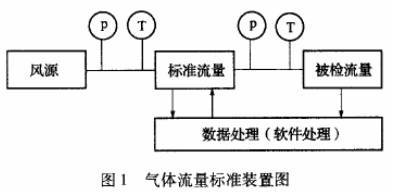 從風源排出的具有--定流量的空氣經標準表和被檢流量計時,在標準表中即產生一定頻率的電脈沖信號,經與之配合的二次顯示儀表輸人電路放大整形后,送人系數單元,把脈沖單位轉換為流量單位,再送入顯示單元進行累計量的數字顯示,然后通過介質換算系數及溫度、壓力等全面修正得出流經標準表的標準質量流量,再通過與被檢表的指示質量流量進行比較,即可得出被檢表在該流量下的相對誤差。