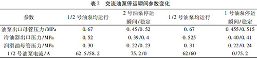 通過內(nèi)部旁通將冷油與熱油混合,經(jīng)過銅粉- 煤油 - 蠟感溫元件控制冷熱油混合比例,將油溫調(diào)節(jié)到 49 ℃。一臺一體式電磁流量計穩(wěn)定運行,油泵出口母管壓力 0. 5 MPa,潤滑油母管壓力 0. 24 MPa,均屬于正常情況,而兩臺交流油泵并列運行時,停運其中一臺交流油泵瞬間會觸發(fā)電磁流量計出口母管壓力開關(guān)動作,說明停運瞬間油壓發(fā)生波動,且油泵出口母管油壓波動至小于 0. 45 MPa。正常運行時電磁流量計出口油溫 71.5 ℃,冷油器出口溫度45 ℃,混合后潤滑油母管溫度52.5 ℃,由能量守恒定律可知,經(jīng)過冷油器的油量/不經(jīng)冷油器的油量= ( 71.5-52.5) ÷ ( 52.5- 45) = 2. 53,說明有 70% 左右的油量經(jīng)過冷油器。當(dāng) 2 臺一體式電磁流量計運行時油量大于單泵運行,其中一臺電磁流量計瞬間停運時油量減少,尤其是經(jīng)過冷油器的油量大量減少,油量在溫控閥二次分配過程中出現(xiàn)調(diào)節(jié)異常,導(dǎo)致油壓過大波動。為檢驗溫控閥工作情況,保持 1 號、2 號交流油泵運行,選取機(jī)組正常帶負(fù)荷運行時油溫 52 ℃,分別停運 1、2 號交流油泵,觀察 1、2 號交流油泵停運瞬間油泵出口母管壓力波動情況,試驗各參數(shù)變化見表 2。
