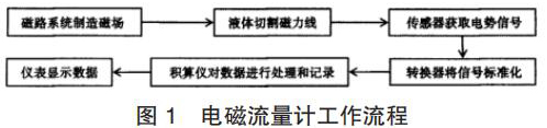 智能渦輪流量計(jì)的產(chǎn)生主要是基于法拉*電磁感應(yīng)定律。在智能渦輪流量計(jì)的應(yīng)用中,磁路系統(tǒng)會(huì)在流量計(jì)運(yùn)行過程中逐步出現(xiàn)直流磁場與交流磁場,該磁場的產(chǎn)生為后期的測量提供了良好的前提條件,營造了測量所需的磁場環(huán)境,因此,在智能渦輪流量計(jì)應(yīng)用時(shí),一旦被測液體在導(dǎo)管中經(jīng)過該磁場環(huán)境時(shí),必然會(huì)產(chǎn)生一定的切割磁力線運(yùn)動(dòng),在這種情況下,電極傳感器就會(huì)發(fā)揮其作用,將導(dǎo)管內(nèi)的流量轉(zhuǎn)換為感應(yīng)電勢信號(hào),隨后此轉(zhuǎn)換形成的信號(hào)逐步被傳遞給轉(zhuǎn)換器。而轉(zhuǎn)換器更是可以將所獲得的流量信號(hào)等加以處理,通過分析、對(duì)比等,轉(zhuǎn)換器會(huì)將該信號(hào)變?yōu)闃?biāo)準(zhǔn)信號(hào),隨后將該信號(hào)輸出給積算儀,進(jìn)一步進(jìn)行信號(hào)的處理,這些處理以后的信號(hào)*終會(huì)在智能渦輪流量計(jì)的儀表中顯示,呈現(xiàn)*終的流量測量結(jié)果,其基本的流程如圖 1 所示。