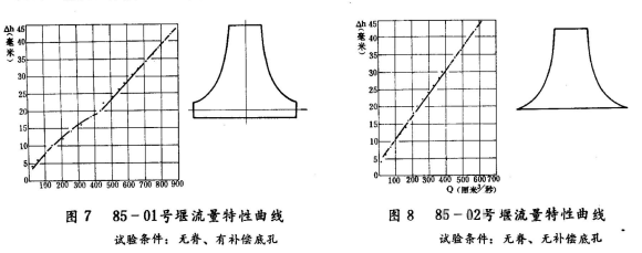 用85-01號(hào)和85-02號(hào)兩種雙曲線薄壁堰,在試驗(yàn)水槽端安裝成無(wú)脊有補(bǔ)償孔和無(wú)補(bǔ)償孔兩種情況,進(jìn)行了多次實(shí)驗(yàn),所得數(shù)據(jù)通過(guò)整理,畫出流量特性曲線,見圖7和圖8。